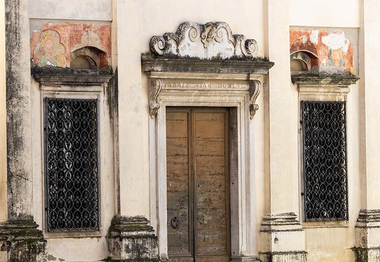Esternamente si può ammirare il portale in pietra, sormontato dal blasone della Confraternita dei Battuti (l’indice e il medio alzati) e il cartiglio recante le parole latine che indicano la duplice natura dell’Agnello Divino. Sull’architrave è inciso l’invito evangelico: “Parate viam domini”, ovvero “preparate la strada del Signore”.
